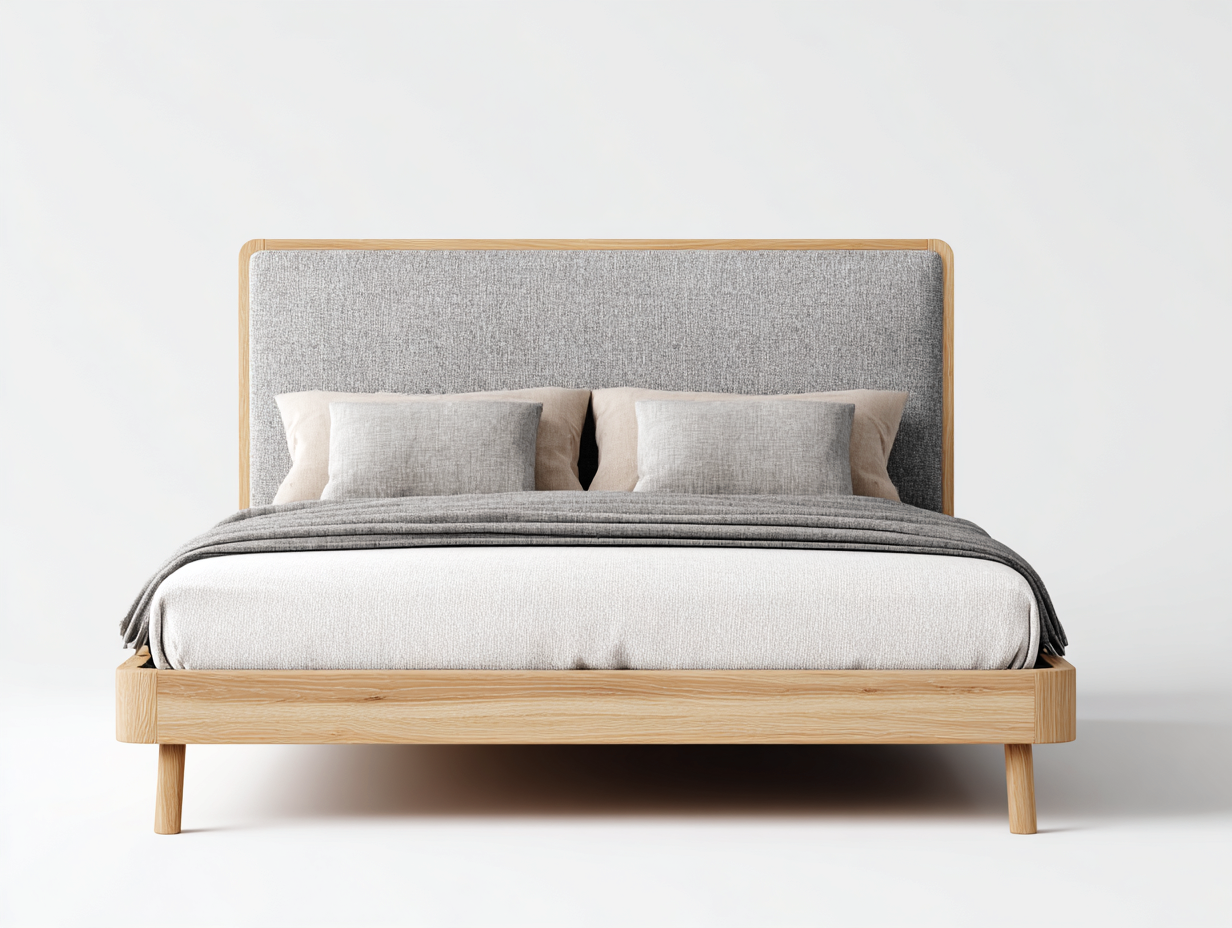 This double bed combines a solid wood frame with an upholstered fabric headboard, offering a balanced modern look and comfortable bedroom support. The clean-lined structure suits contemporary residential interiors.