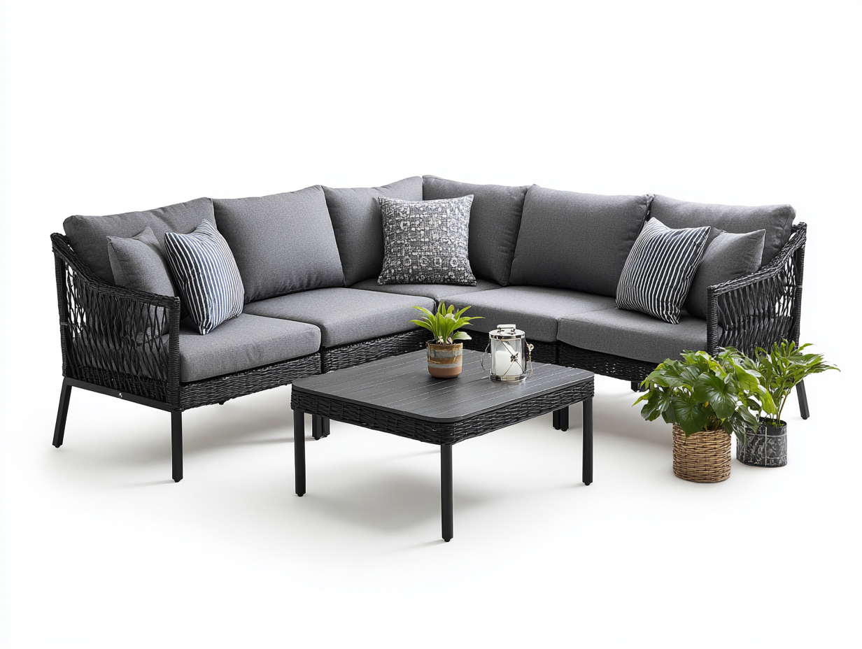 This outdoor sofa set provides a spacious and balanced seating solution designed for patios terraces and garden areas. The square sectional layout offers a comfortable lounge experience, while the dark woven structure and grey seating surfaces create a modern outdoor atmosphere.