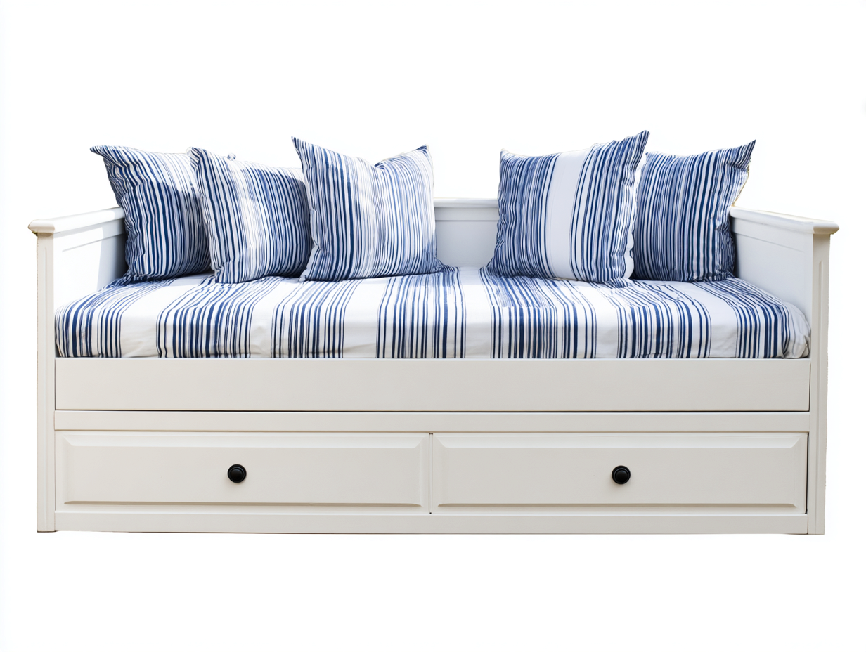 The frame is crafted from engineered wood with a smooth white painted finish. The seating and sleeping surface is upholstered in blue and white striped fabric, providing a fresh and timeless appearance.